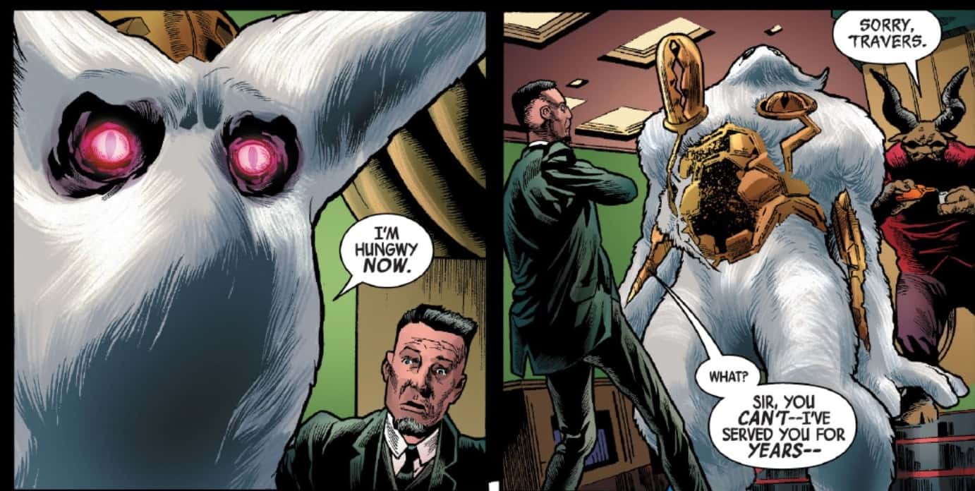 'Immortal Hulk' is known for its body horror and sinister storytelling, but it may have just outdone itself. In #32, after Xemnu has successfully hypnotized the world into believing he's its greatest hero, he's starting to feel a little hungry. Working with Dario Agger, of Roxxon, he asks when he can eat. The large, fluffy, brainwashing alien is "Hungwy now" - and can't wait for Agger's loyal lieutenant to go fetch somebody else. Xemnu immediately begins to unravel, and consume dagger's bodyguard in a horrific manner whose image we're not even going to share here. If you haven't read the issue, take our word for it - it was horrifying.