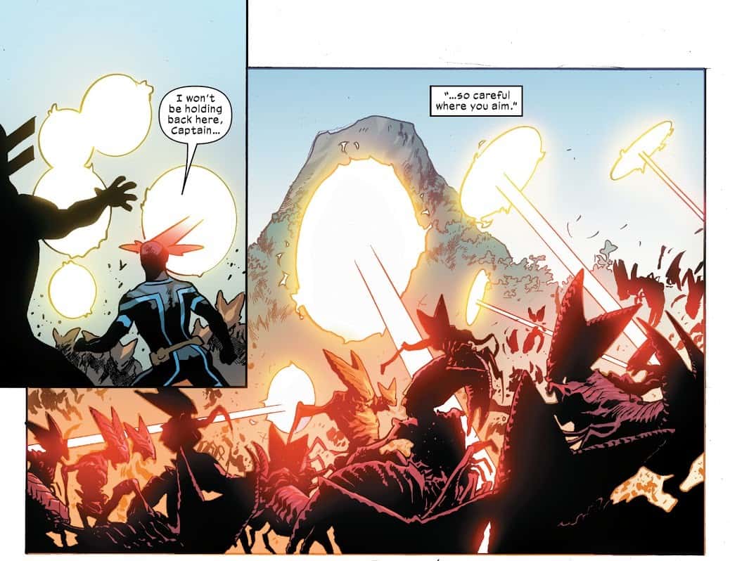 The Colossus-Wolverine combo move the "Fastball Special" is an absolute classic but in 'X-Men' #8, Colossus's little sister Magik and Wolverine's sort-of boyfriend (it's complicated) Cyclops reveal their own combined attack and it is far more devastating than anything Piotr and Logan could ever dream of. Unleashing his eye-beams through Magik's portals to rain devastation down on an invading Brood army, Cyclops proves once again why he's the real top dog of the X-Men in a panel that's beautifully illustrated by Mahmud Asrar with Sunny Gho providing some stunning colors.