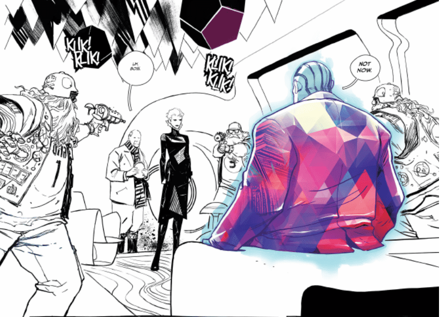 'Decorum' #1 does very inventive things with storytelling, using a variety of art styles to convey things that the writing doesn't overtly state. One of the most standout moments of the issue is the introduction of the series protagonist, the universe's most well-mannered assassin. Though the world outside is colored, as soon as she's in the room, all color bleeds out aside from that of her target, the most vivid focus in the room. The assassin never loses sight of her target - until he's taken out, and it's not until then that color bleeds back into the room. It's a brilliant piece of visual storytelling, brought to you by Mike Huddleston.