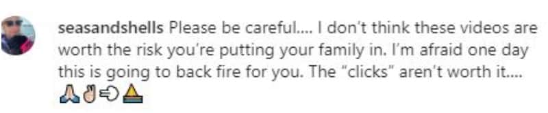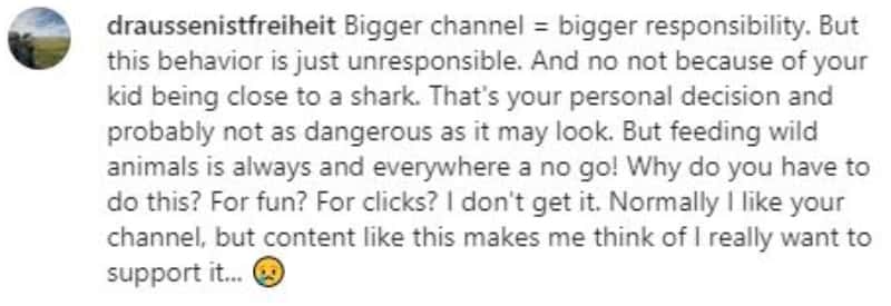 A user wrote, “Please be careful…. I don’t think these videos are worth the risk you’re putting your family in. I’m afraid one day this is going to back fire for you. The “clicks” aren’t worth it.” Another user commented, “Not cool. Your child looks scared. You won’t get my support on content like this, I’m unfollowing.”A user complained, “Bigger channel = bigger responsibility. But this behavior is just unresponsible. And no not because of your kid being close to a shark. That's your personal decision and probably not as dangerous as it may look. But feeding wild animals is always and everywhere a no go! Why do you have to do this? For fun? For clicks? I don't get it. Normally I like your channel, but content like this makes me think of I really want to support it...” A user commented, “Wtf??? This is totally unacceptable! What you won’t do just get peoples attention! Shocking! You live only to get attention. Must be a very shallow life. What a shame.”