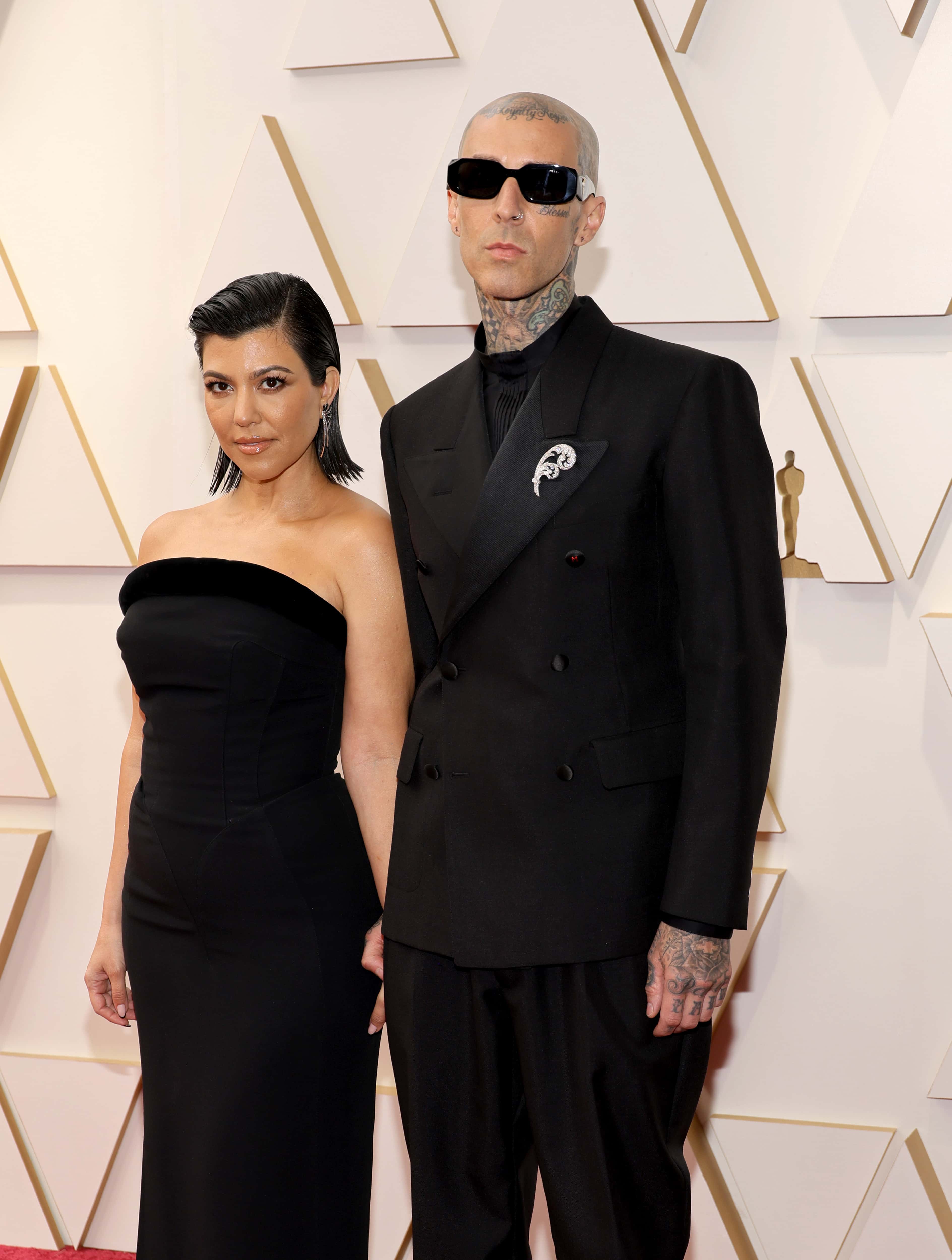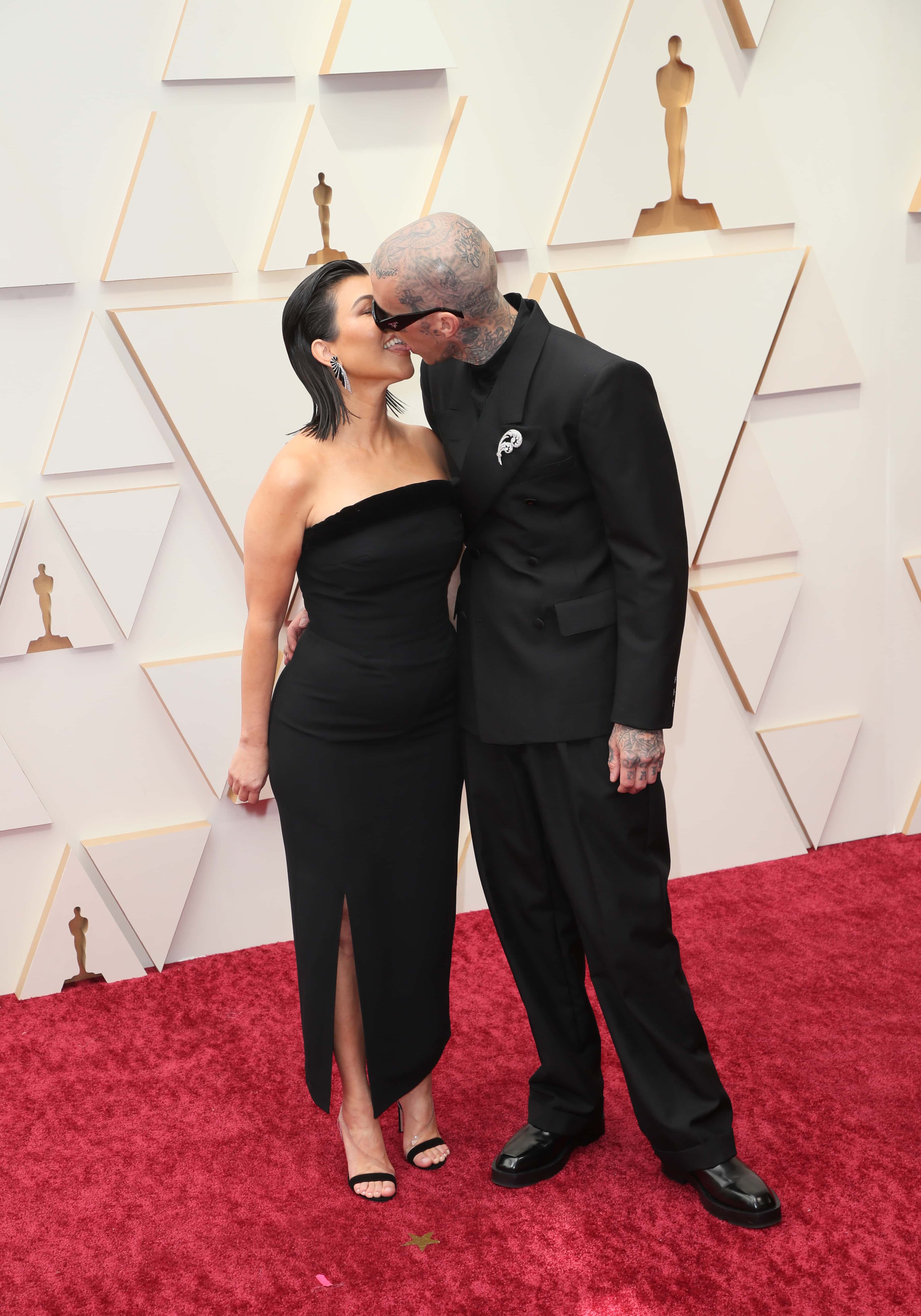 At the 94th Annual Academy Awards red carpet Sunday night (March 27), Kourtney Kardashian and Travis Barker once again flaunted their over-the-top affection for each other by touching tongues. In front of photographers, the loving pair shared a beautiful smooch while flaunting their matching all-black ensembles. Meanwhile, the Kardashians star is attending the Oscars for the first time. She was invited as Barker's plus-one since she will be performing with an all-star band that includes Oscars music director Adam Blackstone, percussionist Sheila E., and others.