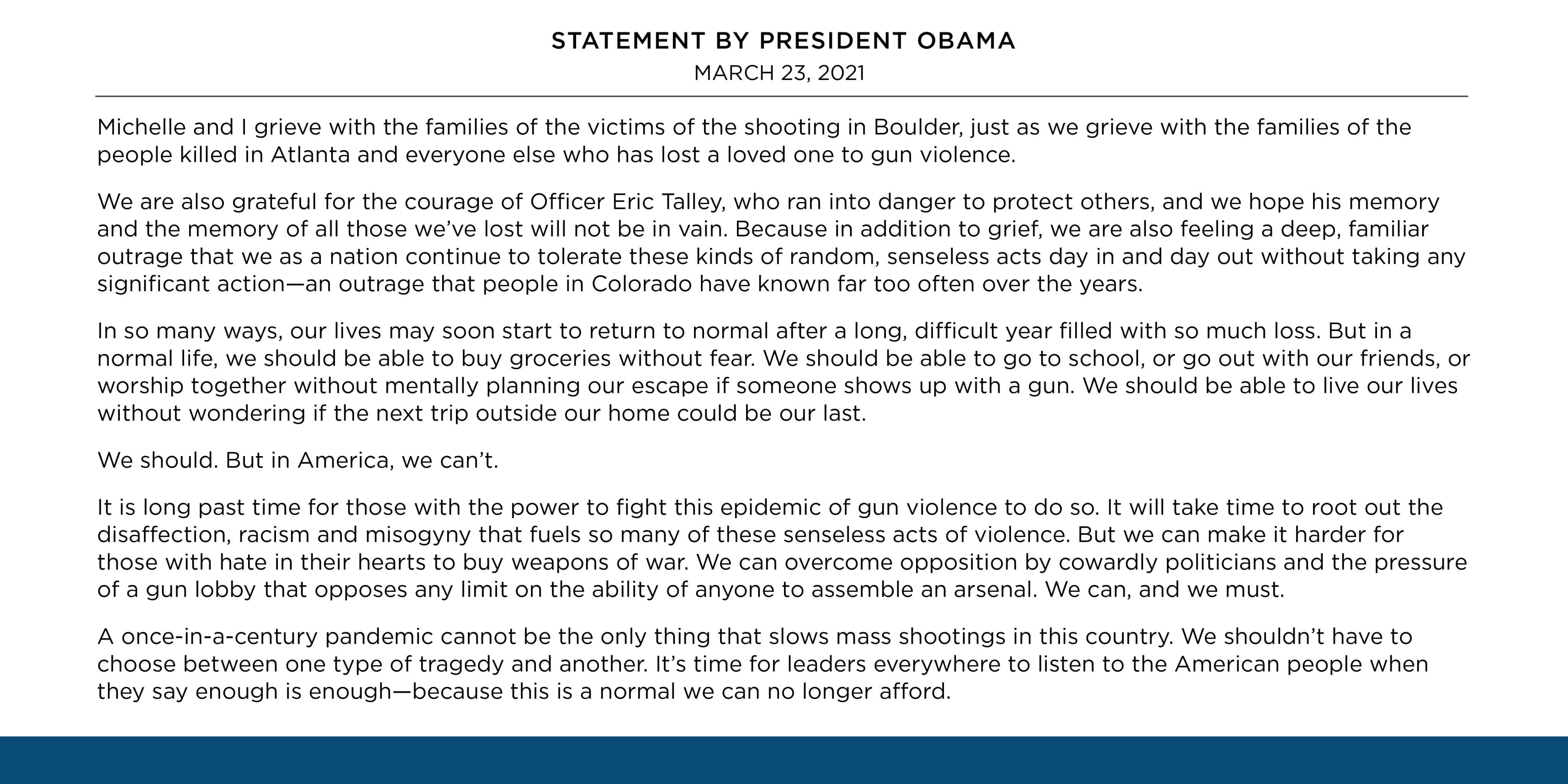 The former president issued a brief statement through social media where he said, "A once-in-a-century pandemic cannot be the only thing that slows mass shootings in this country." Obama did not specify if he backed any particular legislation or bills, but it was clear from his statement that he believed that more reforms were needed. That's the line many democrats, including President Joe Biden, are taking in response to the shooting.
