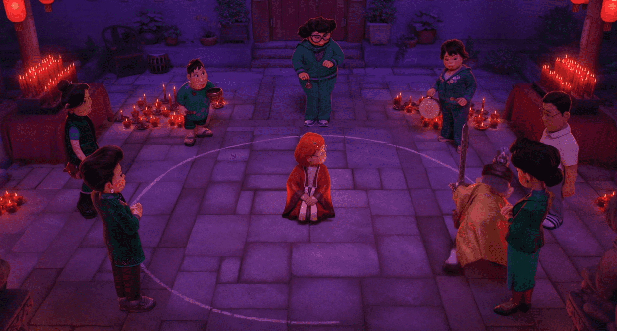 The ceremony to banish the red beast begins with Mei at the center of the circle and each member singing a Cantonese song. Mei was attempting to concentrate on voices, allowing them to help her through her inner storm. Throughout the film, the red panda appears to be a fault rather than a strength, but Mei discovers the red panda within her to be powerful, and she does not allow the panda to lose her. Spoiler alert: the entire ceremony is a failure, and Mei keeps the panda as a symbol of her part.