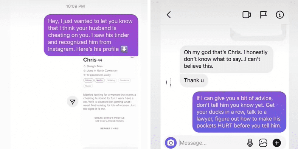 In a viral video, a TikTok user says she saw a married man on Tinder looking to cheat on his disabled wife. She proceeded to out him. Vanessa Riley (@vanessariley_hub) was swiping through Tinder when she came across Chris, a 44-year-old man from North Cowichan, British Columbia.