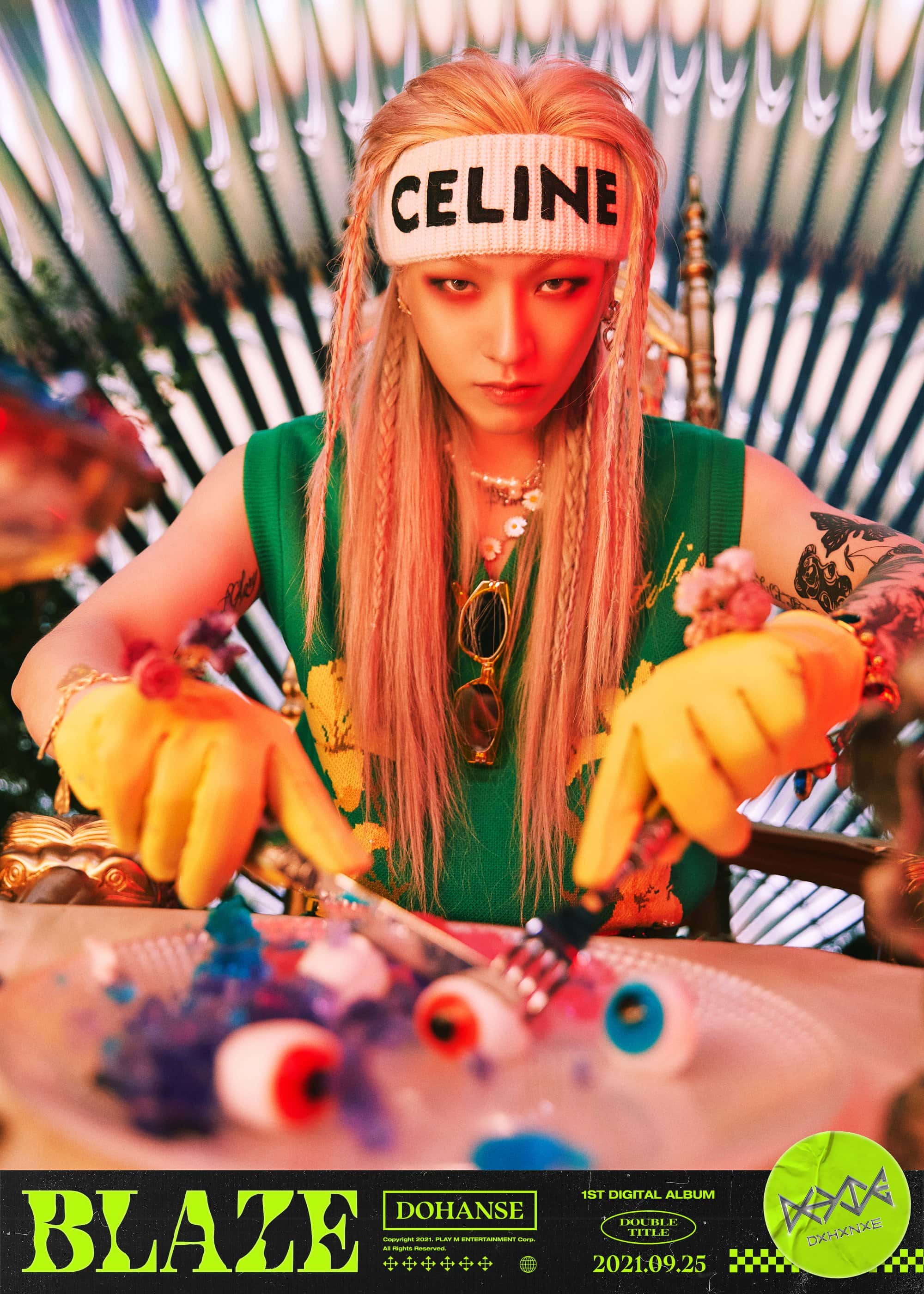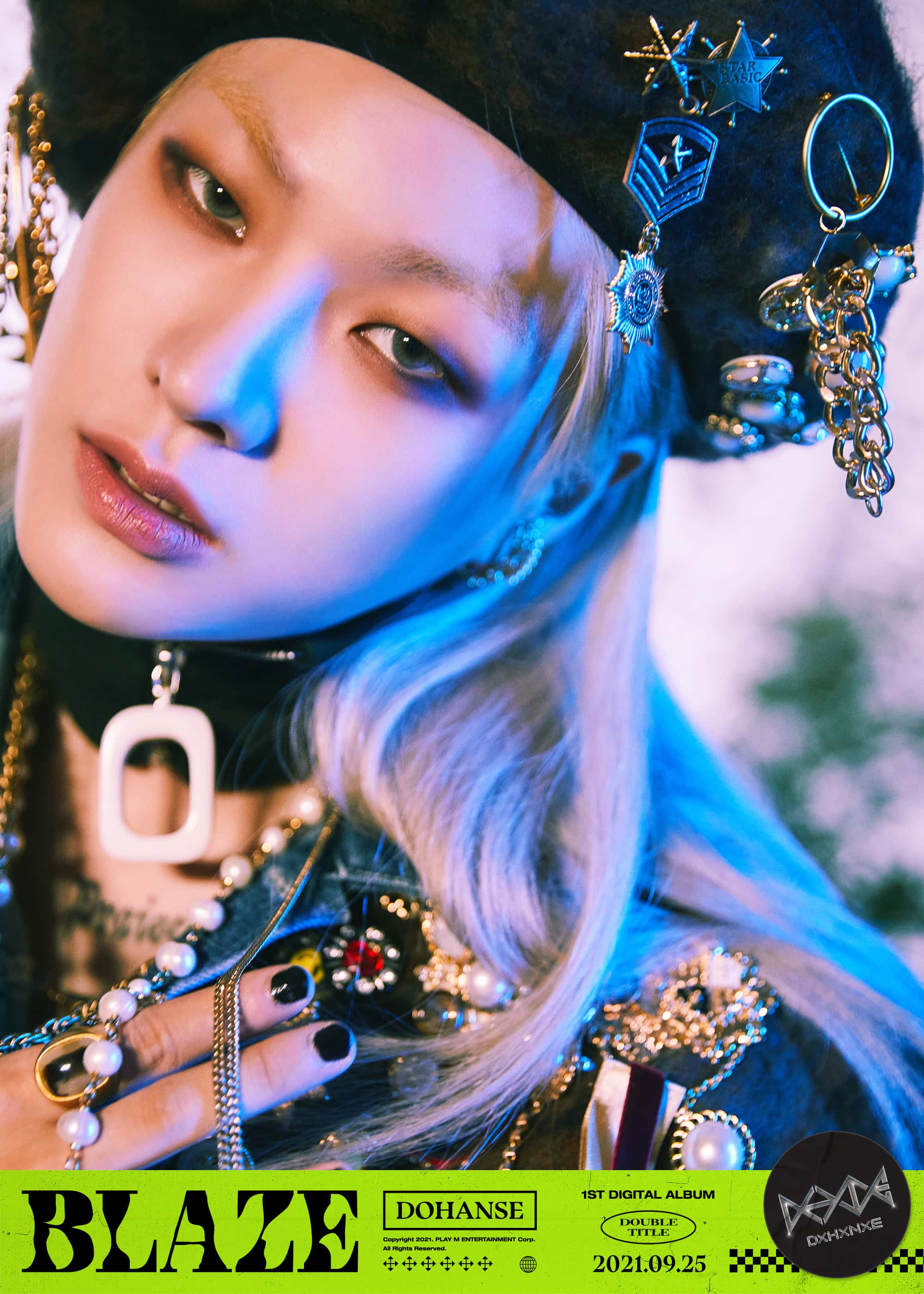 Hanse goes with the bold and confident image that he has made with Victon as he oozes swagger in embellished denim outfits and kitschy props. He explains that like the title 'Blaze', he wants to shine and show his best self for his first album.