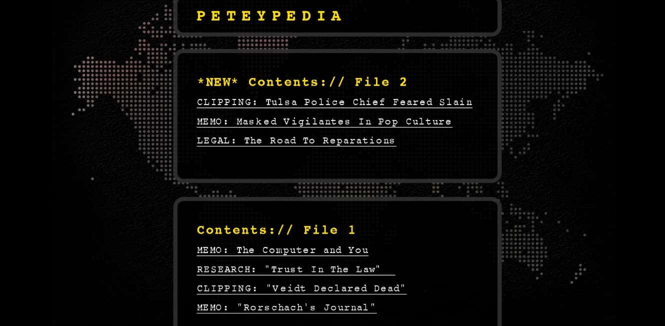 It’s a practice that HBO has brought back with “Peteypedia”, documents collected and written by one Agent Dale Petey and the information contained within these companion pieces show that the world of the ‘Watchmen’ series is every bit as intricate as the original series was.