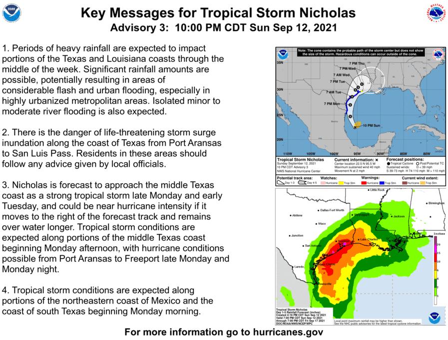 “The State Operations Center has increased its readiness and is prepared to assist local officials in their response to Tropical Storm Nicholas,” Gov Greg Abbott announced Sunday, September 12, in anticipation of the incoming storm. “As this storm approaches Texas, I urge our Southeast Texas and Gulf Coast communities to prepare now to protect themselves and their loved ones from the severe weather conditions that Tropical Storm Nicholas will bring,” the governor said.