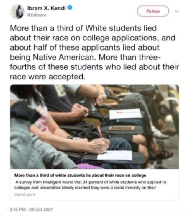Kendi tweeted an article from The Hill. "More than a third of White students lied about their race on college applications, and about half of these applicants lied about being Native American," he tweeted. "More than three-fourths of these students who lied about their race were accepted."
