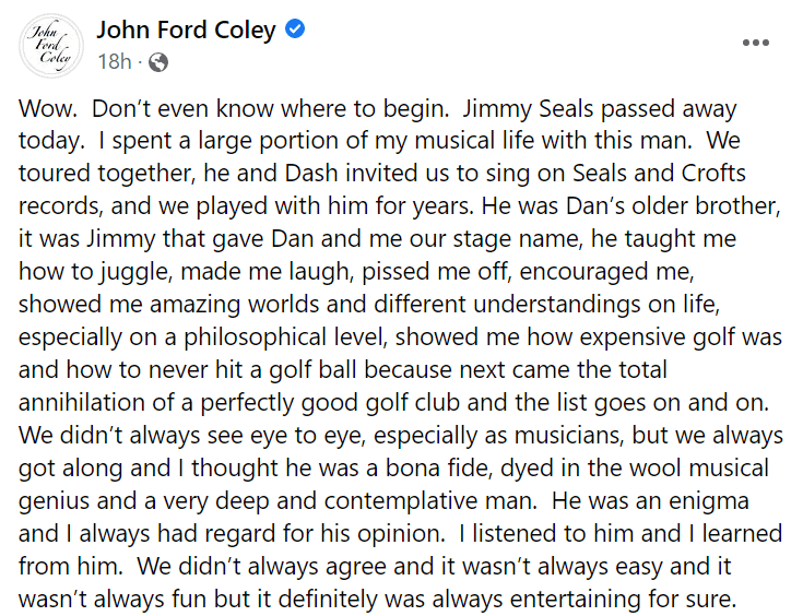 Seals' death was announced on Facebook by musician and colleague John Ford Coley. "Wow. Don’t even know where to begin. Jimmy Seals passed away today. I spent a large portion of my musical life with this man. We toured together, he and Dash invited us to sing on Seals and Crofts records, and we played with him for years. He was Dan’s older brother, it was Jimmy that gave Dan and me our stage name, he taught me how to juggle, made me laugh, pissed me off, encouraged me, showed me amazing worlds and different understandings on life, especially on a philosophical level, showed me how expensive golf was and how to never hit a golf ball because next came the total annihilation of a perfectly good golf club and the list goes on and on. We didn’t always see eye to eye, especially as musicians, but we always got along and I thought he was a bona fide, dyed in the wool musical genius and a very deep and contemplative man," he wrote.