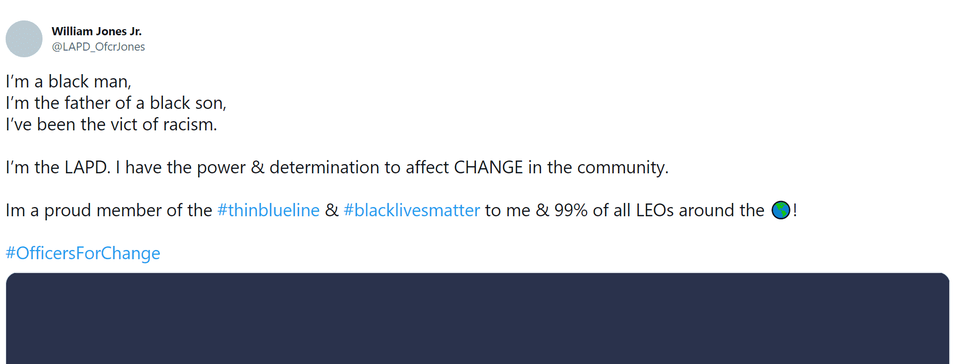 “I’m a black man, I’m the father of a black son, I’ve been the vict[im] of racism,” he wrote in a tweet that has now been removed. “I’m the LAPD. I have the power & determination to affect CHANGE in the community. Im a proud member of the #thinblueline & #blacklivesmatter.”