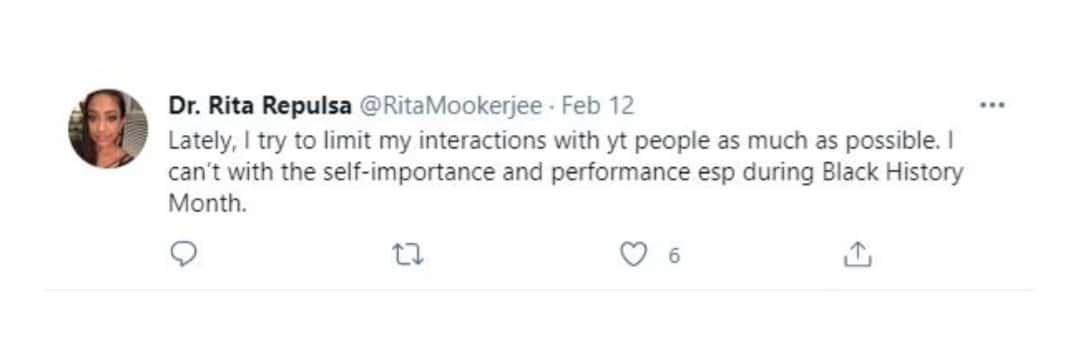 As per Campus Reform, on October 12, 2020, Mookerjee tweeted: “That said, it is foolish to dismiss student critique. Always listen but, learn to accept that Whyte men with dirty hair and wrinkled clothes will always be more liked and higher ranked.” She also wrote, sharing her own photo, “Someone called me white the other day so #NewProfilePic because I think the f**k not.”