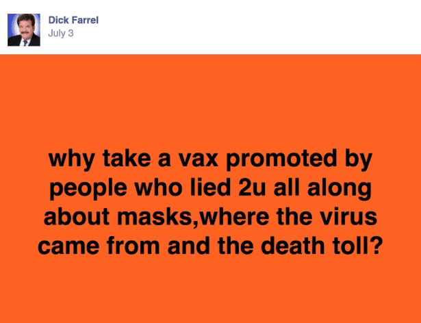 In a July 3, 2021, post, he wrote: "Why take a vax promoted by people who lied 2u all along about masks, where the virus came from and the death toll?” although he didn’t provide any additional context or clarification. "Vaccine Bogus Bull Shid!, Two peeps I know, got vaxed, now have Corona, hospitalized critical," he wrote on July 1. "Thank you Moderna, FOR NOTHING!" Creative Director of Hubbard South Florida Mike McCabe, a friend of Farrel’s, said on Facebook that he had been battling Covid-19 for three weeks before his death earlier this week.