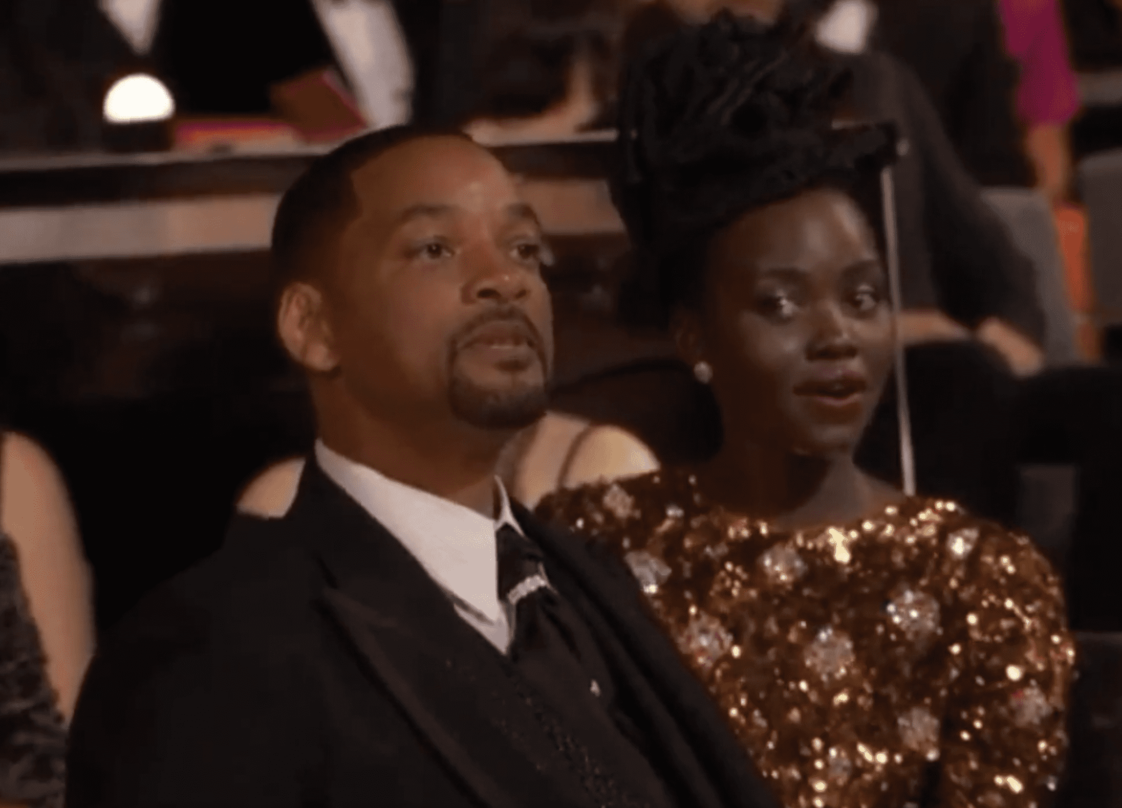 According to Variety, Smith’s publicist Meredith O Sullivan had a discussion with the actor during the commercial break. She wasn't the only one. Rebecca Ford and Denzel Washington also pulled the actor aside for a word during the break. When the show resumed, Smith was seen kneeling with his arm around his wife. Meanwhile, in the lobby, people huddled around their phones watching replays of the incident. “I don’t think that’s a joke,” one woman said. Two others added, “Look, we went to rehearsals, and that was not in Chris Rock’s script."