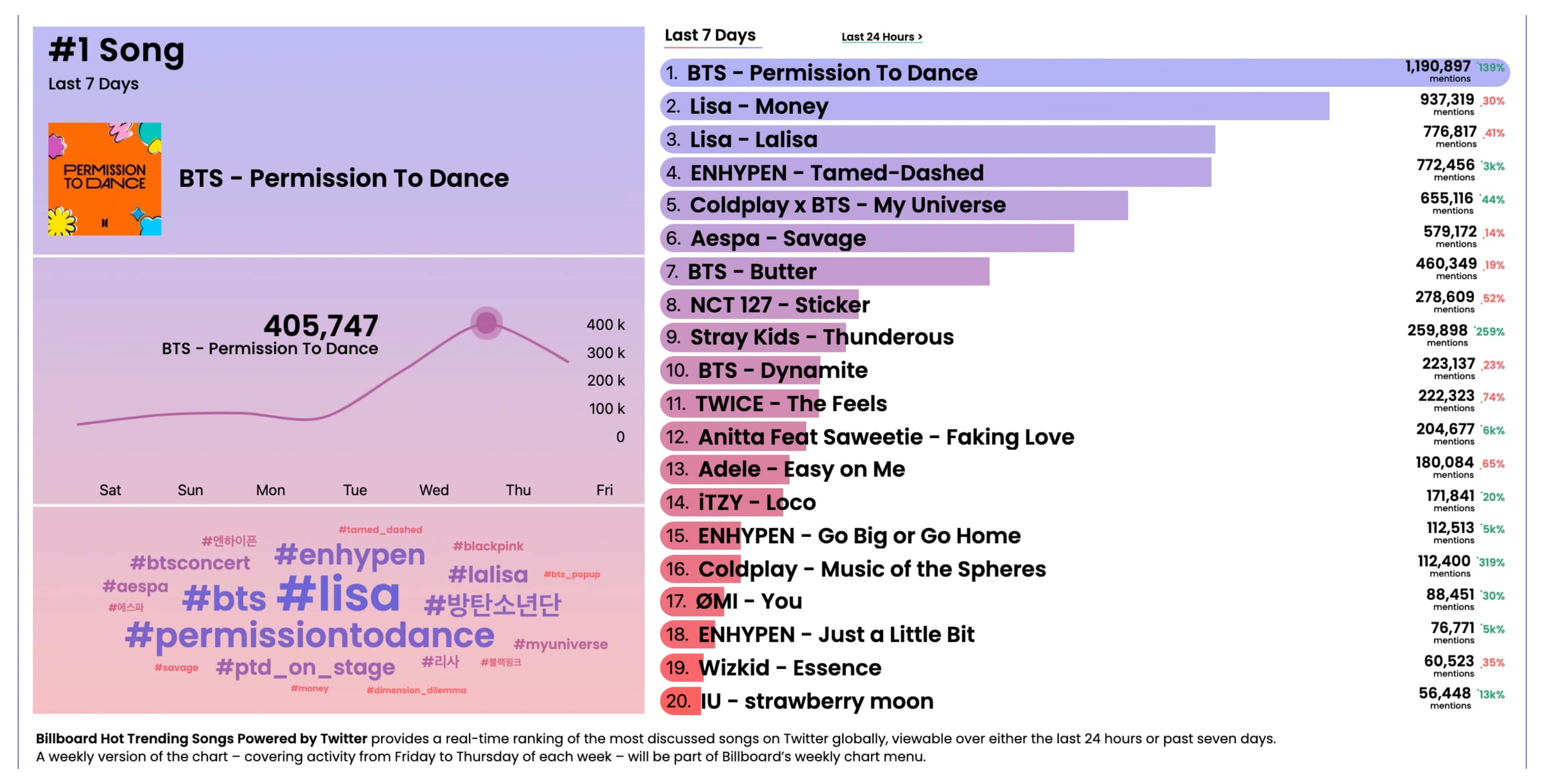 For the chart, Billboard introduced the Top 20 tracks of the week that were the most talked-about songs on Twitter. With their debut chart that was released on October 23, 2021, the Top 20 songs that have been interacted with by fans over the last 24 hours as well as throughout the last week features a total of 14 songs from K-pop idols. Two more songs on the chart featured K-pop acts - Coldplay's 'My Universe' features BTS and ØMI's 'You' was produced by Suga of BTS.