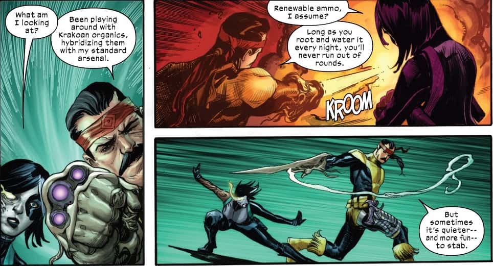 As the Krakoan translator, and creator of the new mutant language, Douglas Ramsey's importance to the new mutant status quo cannot be understated. While his powers of translation have never made him much inclined towards action, the promotional art sees him with a blade made from the same techno-organic material that has made up his arm. The techno-organic material has been teased to have greater ramifications, and may even be the embodiment of Warlock himself.